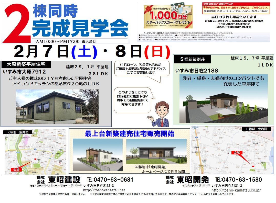 いすみ市日在&大原にて〈ご夫婦・単身家庭、別荘向きのコンパクトな平屋〉と〈ファミリー向けの広々LDKのある平屋〉の2棟同時開催になります